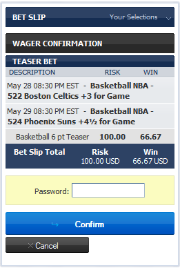 The process of placing teaser bets online is roughly the same from one sportsbook to the next. A teaser card usually comes with a fixed-point spread printed on it so fill out your bet on a card that.